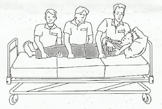 Se realizará por dos celadores, colocados en el mismo lado de la cama. Se enrollará la sábana deslizante por los laterales lo más próximo posible al paciente y a la vez que hacemos fuerza para subirlo, lo giramos