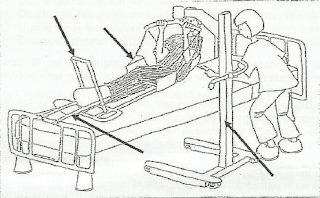 Se realizará por dos celadores, colocados uno a cada lado del paciente y a la misma altura. Se enrollará la sábana deslizante por los laterales lo más próximo posible al paciente y a la vez que hacemos fuerza para subirlo, lo giramos