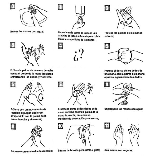 7 - Dentro de la higiene del personal celador uno de los protocolos más importantes es el lavado de manos. Indique qué sucede en el paso que se ha omitido en el siguiente esquema proporcionado por la OMS: