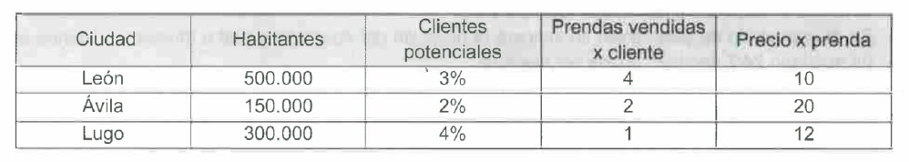 Una cadena de ropa valora la posibilidad de abrir una nueva tienda en tres ciudades diferentes. A continuación, se muestran los habitantes de cada ciudad y una estimación de clientes potenciales, prendas de ropa vendidas por cliente y precio promedio en euros de cada prenda vendida. Con estos datos responda a las tres preguntas siguientes: