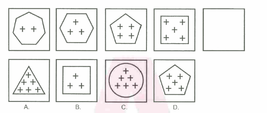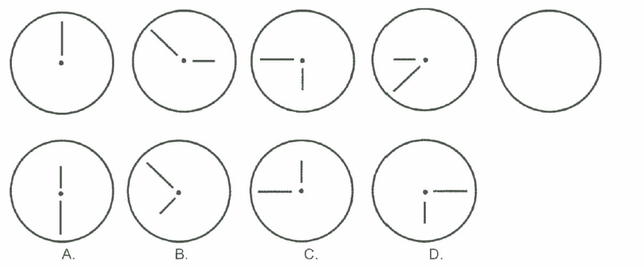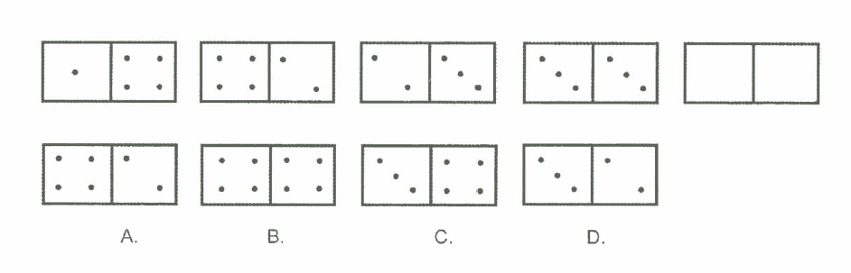Encuentre, entre las figuras inferiores (A, B, C o D), aquella que completa la serie de figuras presentada en la parte superior (nótese que la serie tiene cuatro figuras y falta la quinta).