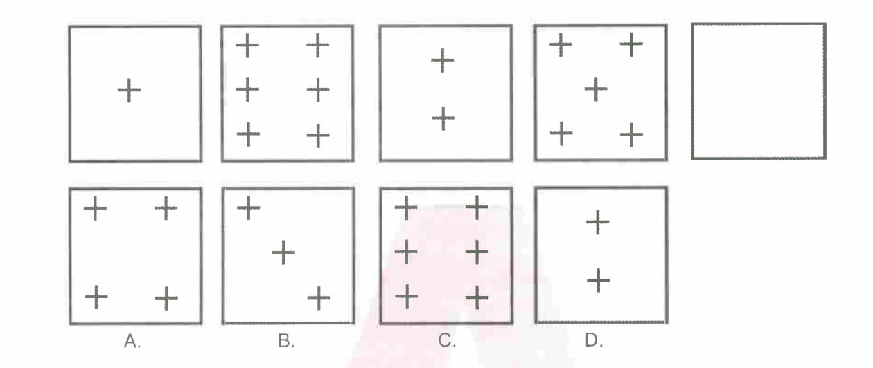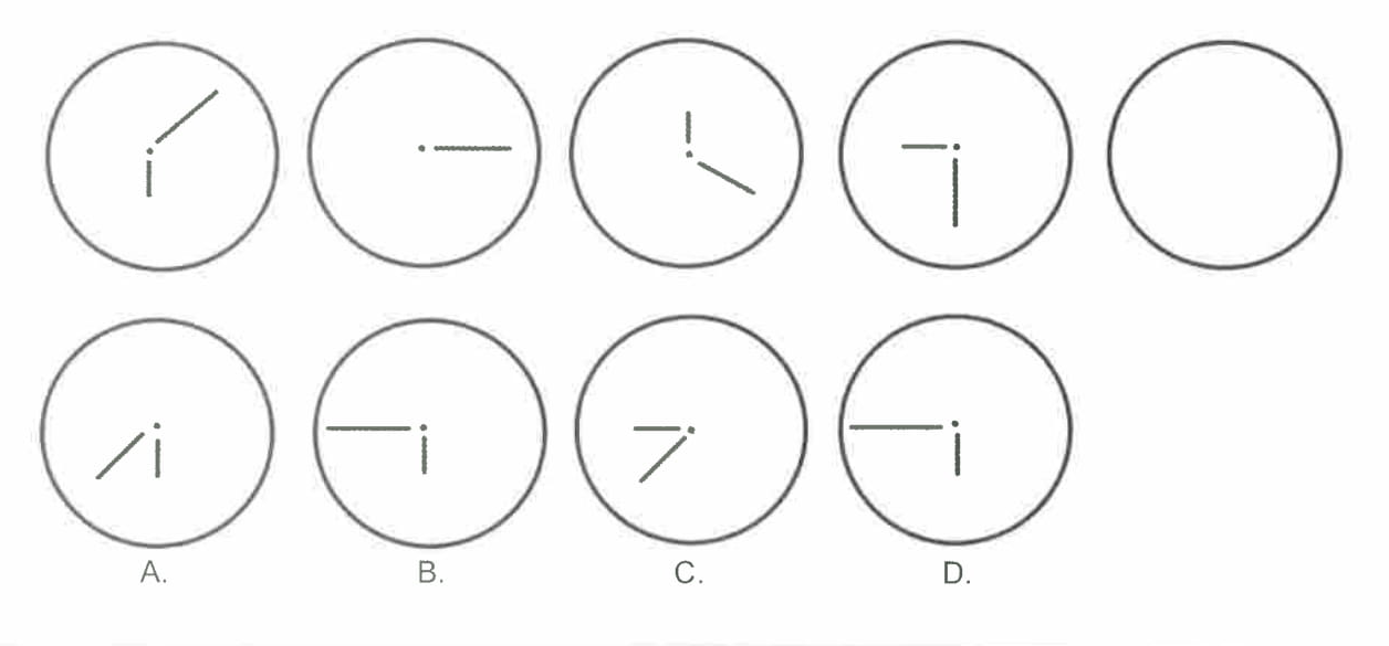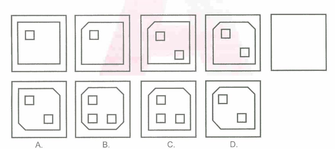 Encuentre, entre las figuras inferiores (A, B, C o D), aquella que completa la serie de figuras presentada en la parte superior.