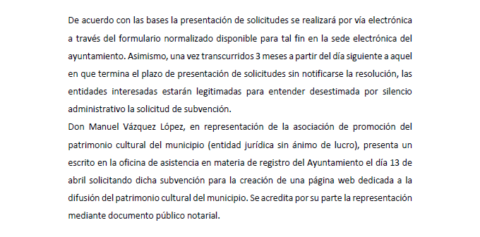 Presenta la solicitud en su propio nombre, lo que no cumple las bases de la convocatoria, dado que la subvención está dirigida a entidades jurídicas sin ánimo de lucro.