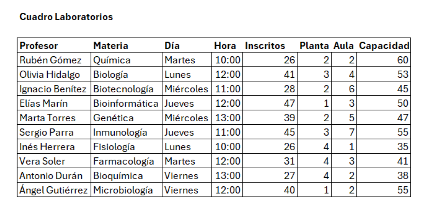 1 - Según los datos del cuadro Laboratorios y suponiendo que asisten todos los inscritos, ¿qué día hay mayor asistencia de alumnos?
