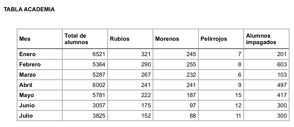 5 - Según la tabla Academia, si todos los alumnos con pelo están representados en las columnas Rubios, Morenos o Pelirrojos, ¿en qué mes ha habido más alumnos sin pelo?