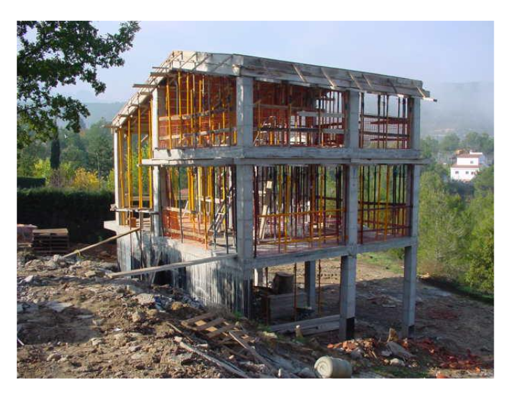 Estructura de hormigón armado (HA) de planta sótano abierta + 2 plantas, con cubierta inclinada.