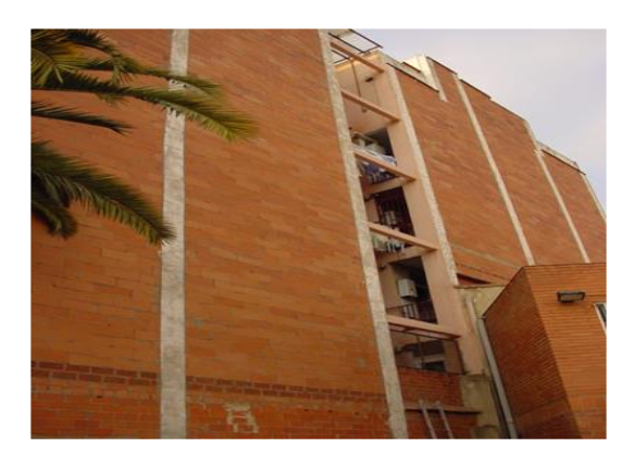 La medianera de un edificio construida con fábrica cerámica.