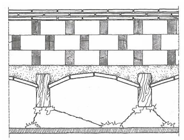 Una pared de carga realizada con piedras trabadas con mortero de cal.