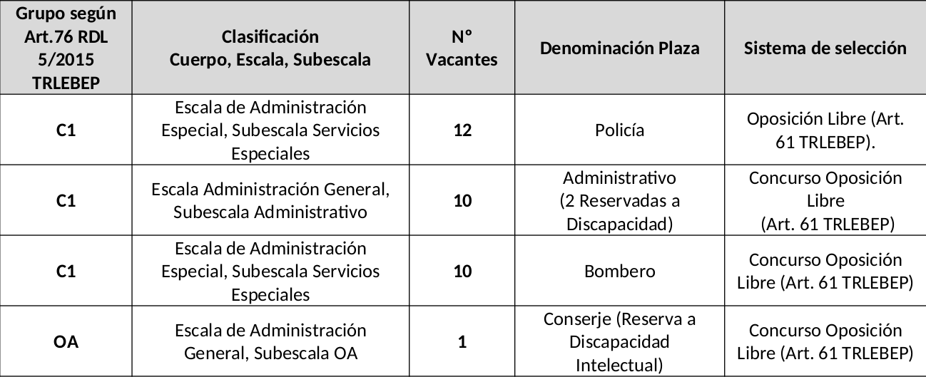 El Ayuntamiento de XXX aprueba la oferta de empleo público del año 2022 mediante acuerdo de Junta de Gobierno Local de fecha 15 de febrero de 2022, siendo publicada en el BOE el 1 de marzo de 2022, conforme al siguiente detalle: